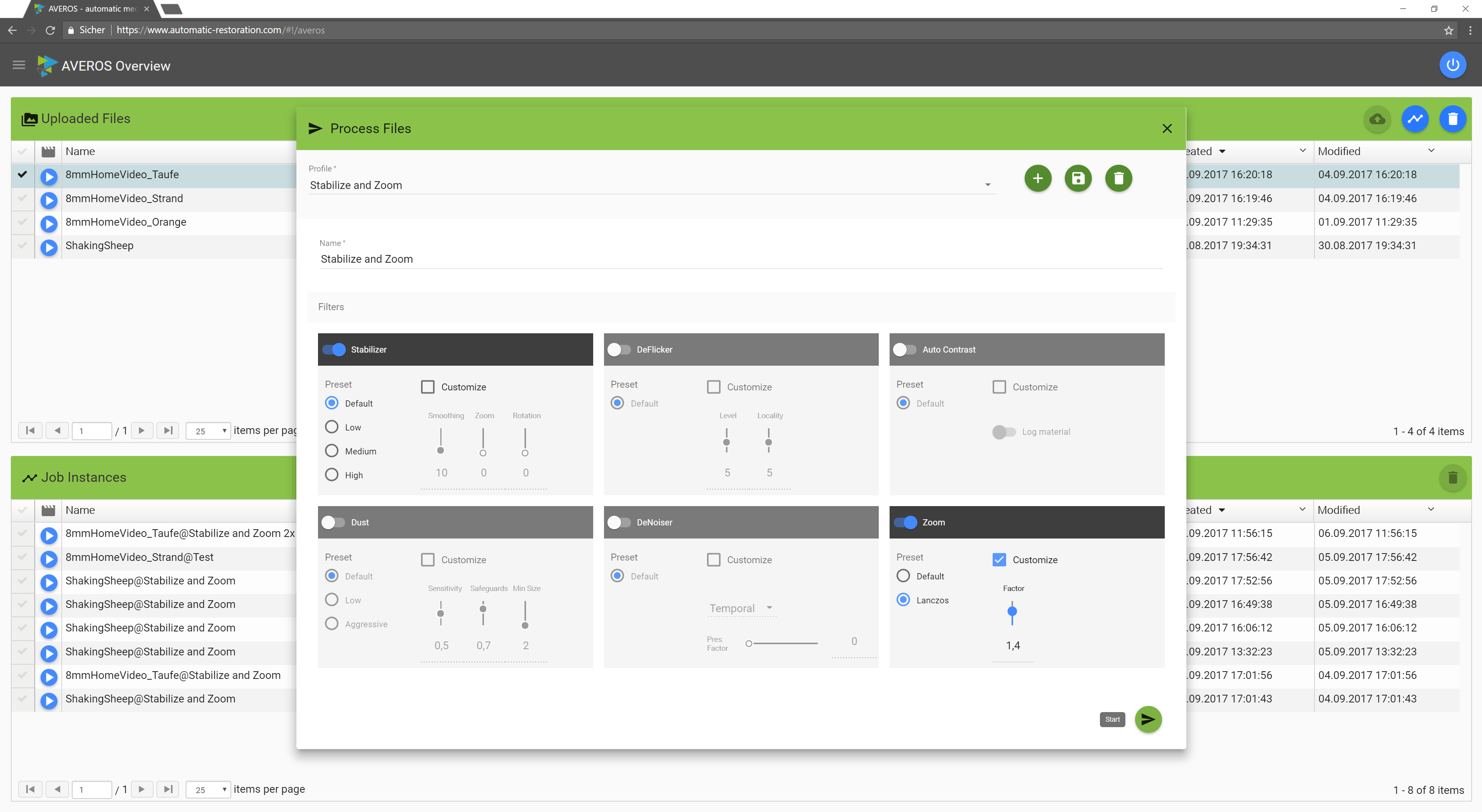 Media enhancement and restoration is currently an intensive manual process. The goal of AVEROS is to create an easily accessible, automated, scalable and fast video restoration and enhancement service operable by non-expert users.